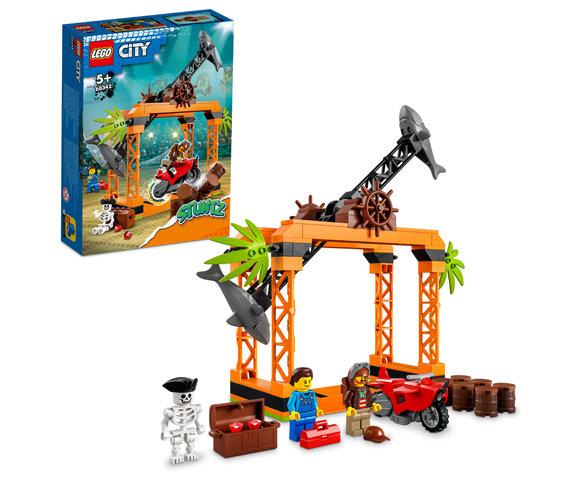 Krenite u akciju s ovim kompletom LEGO City The Shark Attack Stunt Challenge (60342). Djeca aktiviraju motor sa zamašnjakom i otpuštaju ga, izbjegavajući kostur i točak morskog psa koji se okreće. Lupaju kroz bačve i otkrivaju skriveno gusarsko blago. Uključuje 2 mini figure, uključujući Chucka D. Goldberga iz LEGO City TV serije.