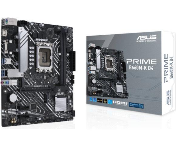 ASUS PRIME B660M-K D4, LGA 1700, Intel B660, DDR4, Broj slotova 2, 64 GB, Takt 2133 - 5333 MHz, PCIe 4.0 x16 1, PCIe x1 2, SATA3 4, 8-kanalni audio, D-sub 1, HDMI 1, RJ45 1, M.2 2, USB 3.2 4 - 90MB1950-M1EAY0