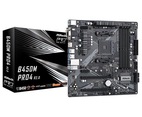 AsRock MB B450M Pro4 AM4 matična ploča (90-MXBEG0-A0UAYZ) Podržava AMD AM4 Socket Ryzen™ 2000, 3000, 4000 G-Series, 5000 i 5000 G-Series desktop procesore - Podržava DDR4 3200 - 1 PCIe 3.0 x16, 1 PCIe 2.0 x16, 1 PCIe 2.0 x1 - AMD Quad CrossFireX™ - Grafički izlaz: HDMI, DVI-D, D-Sub - 7.1 CH HD audio (Realtek ALC892/897 audio kodek)