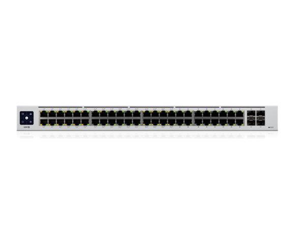 USW-48-PoE je konfigurabilni Gigabitni Layer 2 prekidač sa 48 Gigabit Ethernet portova, uključujući 32 auto-sensing 802.3at PoE+ porta i 4 SFP porta. Pruža Gigabitne PoE veze za vaše RJ45 Ethernet uređaje i Gigabitne fiber uplink opcije za vašu korporativnu mrežu. USW-48-PoE poseduje 1.3-inčni touch LCM za prikaz informacija o statusu.