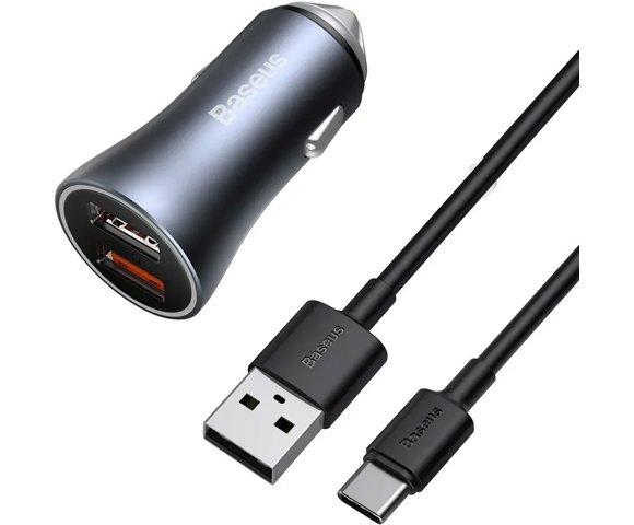 BASEUS 40W smartphone punjač za automobil + kabl 1m USB A na USB C TZCCJD-A0G- Ukupna snaga: 40W - Broj USB portova: 2 - Materijal: Aluminijum - Zaštita: protiv prekomernog punjenja, protiv kratkog spoja, protiv pregrevanja