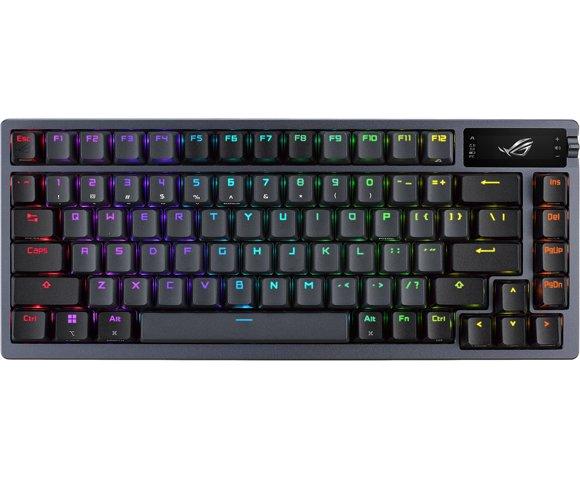 ROG Azoth gaming prilagođena tastatura sa faktorom oblika tastature 75%, troslojnom vlažnom pjenom i metalnim gornjim poklopcem, vrlo prilagodljiva s mehaničkim prekidačima ROG NX s prethodno podmazanim prekidačima, ROG stabilizatorima tastature, PBT duplim poklopcima i kompletom za podmazivanje, tri - načina povezivanja sa SpeedNova tehnologijom od 2,4 GHz, OLED ekranom, trosmjernim kontrolnim gumbom, tri ugla nagiba i podrškom za Mac