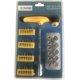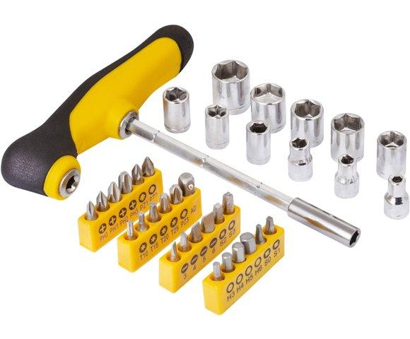 11x nasadnih ključeva 4, 5, 6, 7, 8, 9, 10, 11, 12, 13, 14mm, 24x bitova H3, 4, 5, 6; T10, 15, 20, 25; SL3, 4, 5, 6; PH0, 1, 2, 3; PZ1, 2, 3; S0, 1, 2, 3, Šrafciger |