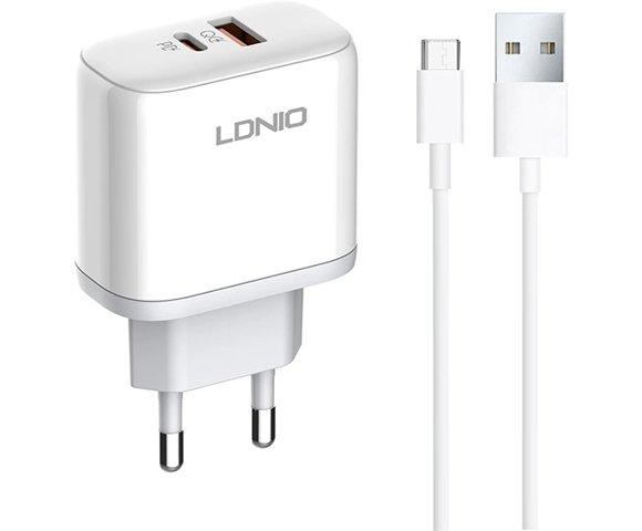 LDNIO A2526C 45W QC4.0 Dual USB-A/USB-C punjač beli + microUSB kabl, Snaga: 45W, Voltaža: 5V/3A, Priključci: 1x USB, 1x USB-C, Micro USB kabl, Dužina kabla: 1m, Boja: Bijela