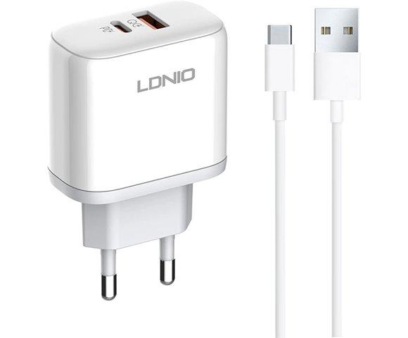 LDNIO A2526C 45W QC4.0 Dual USB-A/USB-C punjač beli + USB-C kabl, Snaga: 45W, Voltaža: 5V/3A, Priključci: 1x USB, 1x USB-C, Kabl tip C, Dužina kabla 1m, Boja: Bijela