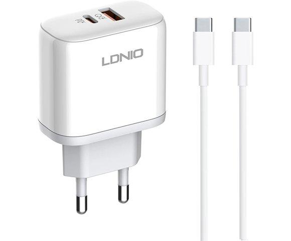 LDNIO A2526C 45W QC4.0 Dual USB-A/USB-C punjač bijeli + Tip-C na Tip-C kabl │ Snaga: 45W, Voltaža: 5V/3A, Priključci: 1x USB tip A, 1x USB-C, Boja: Bijela