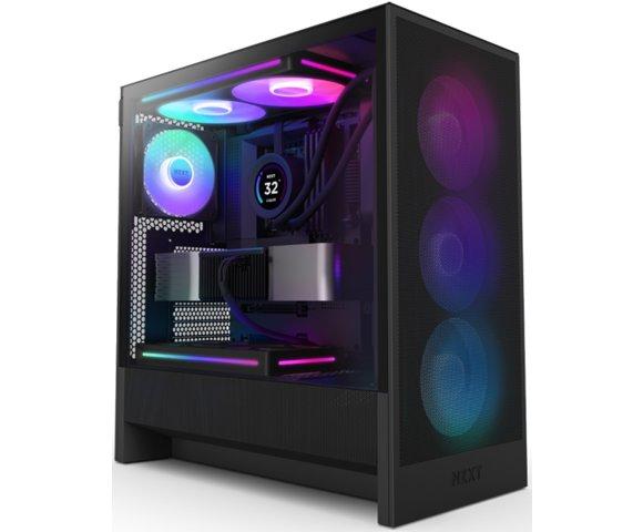 NZXT H5 Flow RGB Gaming kućište (CC-H52FB-R1), Format kućišta: Mid Tower, Matične ploče: ATX, E-ATX, microATX, Mini-ITX, Ležišta: 1x 3.5", 2x 2.5", Priključci: 1x USB 3.2 Gen 1, 1x USB 3.2 Gen 2x2, 1x 3.5mm audio, Ventilatori: 1x360mm (prednji, F360 RGB Core), 1x120mm (zadnji, F120Q), Podrška za hladnjake: Do 360mm (prednji), 280mm (gornji sa LP memorijom), Kompatibilnost: GPU do 410mm, CPU hladnjak do 170mm, Dimenzije: 465x430x225 mm, Materijal: Kaljeno staklo, Metal, Masa: 7.63 kg, Boja: Crna