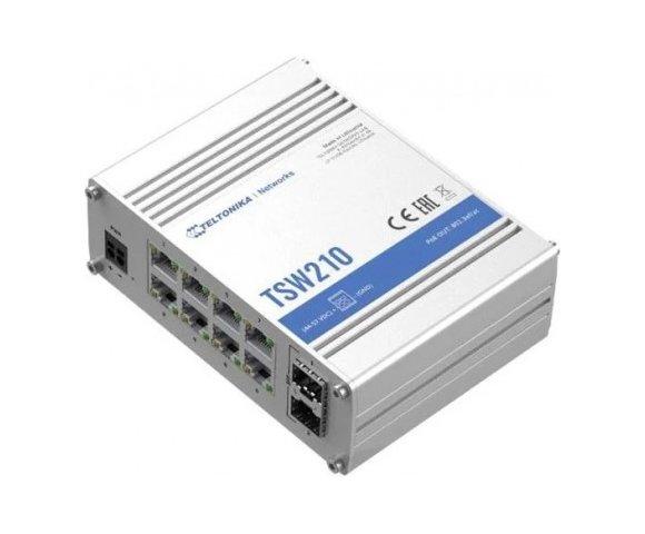 Teltonika TSW210 switch, Ethernet: 8 x RJ45 (10/100/1000 Mbps), 2 x SFP, Propusni opseg: 20 Gbps, MAC tabela: 2K unosa, Napajanje: 7-57 VDC, Potrošnja: 1.03 W (idle), 3.71 W (max), Dimenzije: 132 x 44.2 x 95.1 mm, Težina: 500 g, Kućište: Aluminijum, Montaža: DIN, zidna ili ravna površina