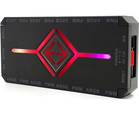 EVESKY ARGB & PWM kontroler, Tip: Kontroler ventilatora i LED traka, Priključci: 9x ARGB (3-pin), 9x PWM (4-pin), Funkcije: Automatska regulacija brzine ventilatora, kontrola buke, upravljanje svetlosnim efektima (360+ modova), Dimenzije: 111.5 x 55 x 15 mm, Upotreba: ARGB & PWM LED inteligentni kontroler