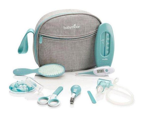 BABYMOOV ESSENTIAL BABYCARE SET, Broj dodataka: 9, Sadržaj: Noktorez, toplomer, sobni toplomer, aspirator, četka, makazice, turpija, masažer za desni, Torba: Lagani neseser sa više pregrada, Materijal torbe: 100% poliester