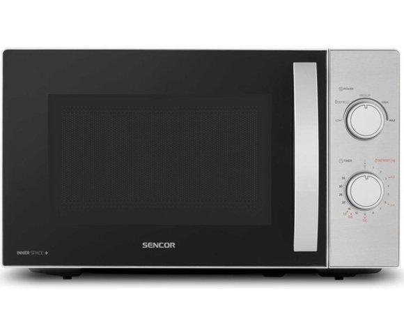 SENCOR SMW 2120SS mikrotalasna rerna │ Snaga: 700W, Kapacitet: 20L, Rotirajući tanjir: 25.5cm, Dimenzije: 440mm x 364mm x 259mm, Težina: 10kg, Materijal: Nerđajući čelik, Emajl, Boja: Siva, Funkcije: Tajmer, Zvučni signal, 5 nivoa snage, Kontrola: Mehanička