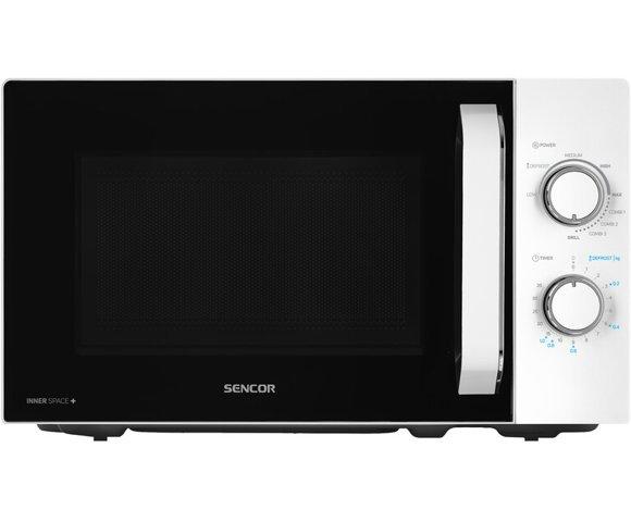 SENCOR SMW 4220WH mikrotalasna rerna, Snaga: 700W, Snaga grila: 1000W, Kapacitet: 20L, Dimenzije: 440mm x 364mm x 259mm, Materijal: Emajl, Boja: Bijela, Rotirajući tanjir: 25.5cm, Funkcije: Tajmer, Odmrzavanje, Kontrola: Mehanička, Ostalo: 5 nivoa snage, Lako za čišćenje