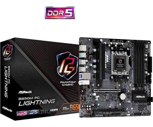 Asrock B650M PG Lightning AMD B650 micro ATX matična ploča │ Socket: AM5, Čipset: AMD B650, Memorija: 4x DDR5, do 192GB, do 7200 MHz, PCIe: Gen 3.0 x16 (1), Gen 4.0 x16 (1), M.2 (3), Skladište: 7 uređaja, SATA III, PCIe 4.0/5.0, Ethernet: 2.5Gb Dragon RTL8125BG, Audio: Realtek ALC897, 7.1 kanala, Format: micro ATX, Dimenzije: 244 x 244 mm │