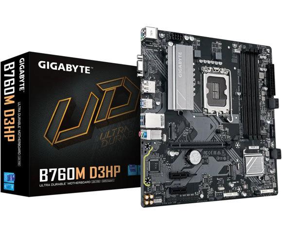 Gigabyte B760M D3HP matična ploča, Matična ploča: Intel B760, mikro ATX, Podnožje: LGA 1700, Podržani CPU: Intel 12/13/14th Gen Core, Celeron, Pentium Gold, RAM: 4x DDR5 DIMM (do 256GB, 5600MHz, ECC/Non-ECC), Slotovi: 1x PCIe 4.0 x16, 2x PCIe 3.0 x1, 2x M.2 (2280, PCIe 4.0), 4x SATA III, RAID: 0, 1, 5, 10, LAN: Realtek RTL8111H Gigabit LAN, I/O: 2x USB 2.0, 3x USB 3.2 Gen1, 1x HDMI 2.1, 1x DP 1.2, PS/2, VGA, 3x audio, 1x RJ-45