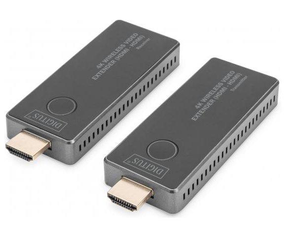 Digitus DS-55323 4K Wireless HDMI Extender Set, Bežični domet: do 30 m, Rezolucija: 4K UHD (2160p/30Hz), HDMI: 2.0 (RX) / 1.4 (TX), Bežični standard: Wi-Fi 2.4/5 GHz (802.11 b/g/n/ac), Enkripcija: AES 128-bit, WPA2, Latencija: ~100 ms, Kompresija: H.265, Audio: PCM, 2 kanala, Napajanje: USB-C, TX 5V/1A, RX 5V/0.6A, Dimenzije: 8.1 x 3.4 x 1.3 cm, Težina: TX 31g, RX 28g, Plug & Play