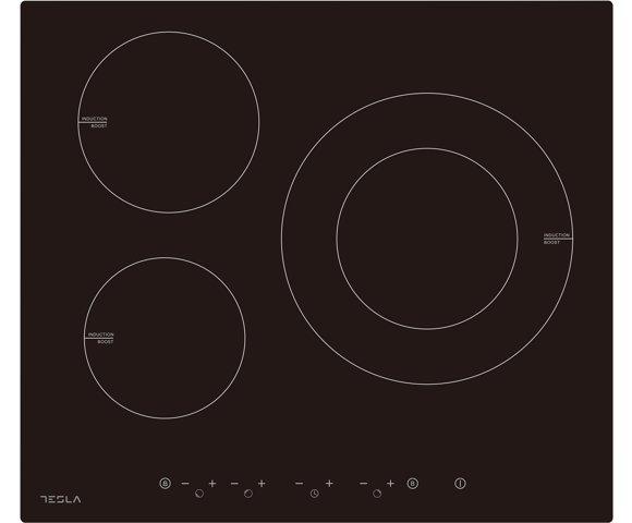 Tesla HI6301MB indukcijska ugradna ploča, Snaga: 7400 W, Zone: 3 (1500 W Ø160 mm, 2100 W Ø180 mm, 3000/3800 W Ø290 mm), Upravljanje: Touch, Nivoi snage: 9, Tajmer: Do 99 min, Funkcije: Senzor za posuđe, sigurnosno isključivanje, zaštita za djecu, Indikator toplote, Dimenzije: 520×590×60 mm, Ugradne mjere: 560×490 mm, Težina: 9,6 kg