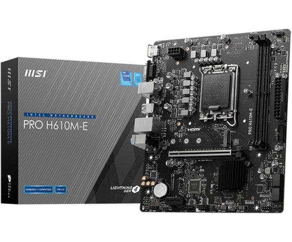 MSI PRO H610M-E matična ploča, Matična ploča: Intel H610, micro ATX, Podnožje: LGA 1700, RAM: 4x DDR5, do 96GB, 5600MHz, Grafika: HDMI 1.4, VGA, Skladištenje: 1x M.2, 4x SATA III, PCIe slotovi: 1x PCIe x16 (Gen 4), 2x PCIe x1 (Gen 3), Mreža: 2.5Gbps Ethernet, Audio: 7.1 CH