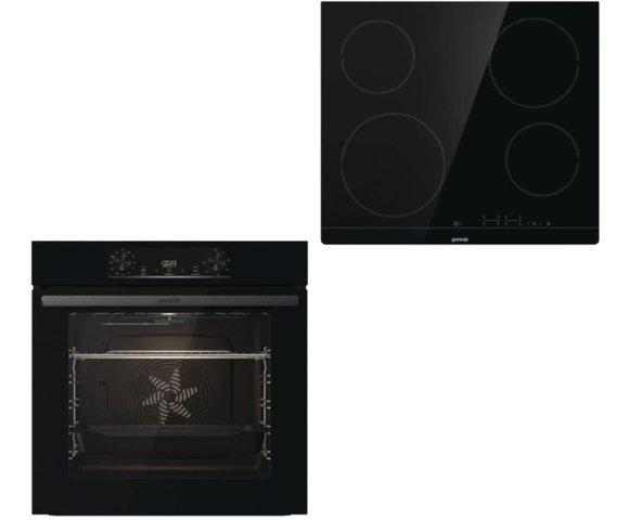 Gorenje Jump Aqua/C ugradni set pećnica (BO6735E02BK) + ploča (ECT641BSC) — Pećnica │ Zapremina: 77L, Energetska klasa: A, Maks. temperatura: 300°C, Načini grijanja: FastPreheat, ventilator, GentleBake, FrozenBake, Pizza, infra grijači, Ugradne dimenzije: 560–564 x 590–600 x 550 mm — Ploča │ Tip: Staklokeramička ploča, Zone: 4 brzozagrijavajuće zone (2300W, 1800W, 2x1200W), Funkcije: StayWarm, Ugradne dimenzije: 560 x 70 x 490 mm