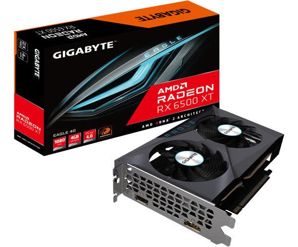 Kućni ljubimciGIGABYTE RX 6500 XT EAGLE OC 4GB grafička kartica (GV-R65XTEAGLE-4GD), Grafika: AMD Radeon RX 6500 XT, 4GB GDDR6 (2815MHz boost, 64-bit magistrala), Hlađenje: Aktivno (GIGABYTE WINDFORCE 2X, 2 ventilatora), Interfejs: PCI Express 4.0, Portovi: 1x HDMI 2.1, 1x DisplayPort 1.4a, Minimalna snaga napajanja: 400W, Dimenzije: 192 x 117 x 38 mm