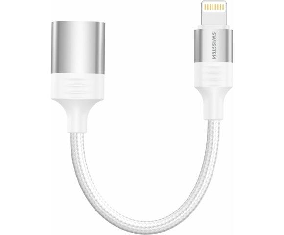 Swissten OTG Adapter Textile Lightning (male) / USB-A (female) 0,12 M White │ Kompatibilnost: Apple uređaji sa Lightning konektorom, Funkcija: Povezivanje USB uređaja sa iPhone/iPad, Materijal: Tekstilna površina, Dužina: 0,13m