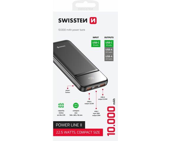 Swissten Power Line II 10000mAh powerbank, Kapacitet: 10,000 mAh (3.7V, 37 Wh), Tip: Li-polimerska baterija, Dimenzije: 14.6×6.8×1.6 cm, Težina: 235 g, Materijal: Vatrootporni ABS + polikarbonat, LED displej, Ulaz (USB-C): do 18W, Izlazi: 2x USB-A do 22.5W, USB-C do 20W, PPS: do 22W, Kabl: USB-C na USB-C (1m, 3A) uključen