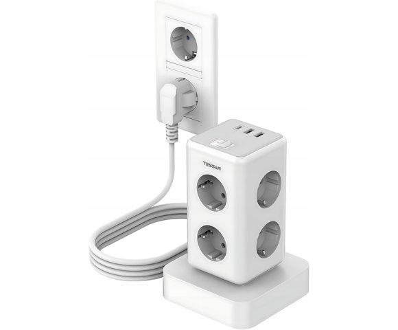 Tessan TS-306TS-C produžni kabl, 6 AC utičnica, 2x USB-A 12W, 1x USB-C 15W, Do 9 uređaja istovremeno, Kabl 2m, Vertikalni dizajn, Razmak 5,5 cm između utičnica, Prekidač za napajanje, Zaštita od prenapona i preopterećenja