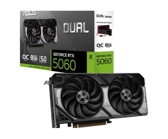 ASUS DUAL RTX 5060 8GB OC grafička kartica (90YV0N12-M0NA00), 8GB GDDR7, 3840 CUDA, 2565MHz (OC), PCIe 5.0, HDMI 2.1b x1, DP 2.1b x3, 2.5 slota, Axial-tech 2x fan