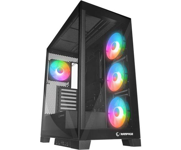 Rampage HYDRA V2 gaming kućište, Tri panoramska panela od kaljenog stakla, 4x ARGB ventilatora, Ugrađeni ARGB kontroler, Podrška za E-ATX ploče, USB-C i USB 3.0 priključci