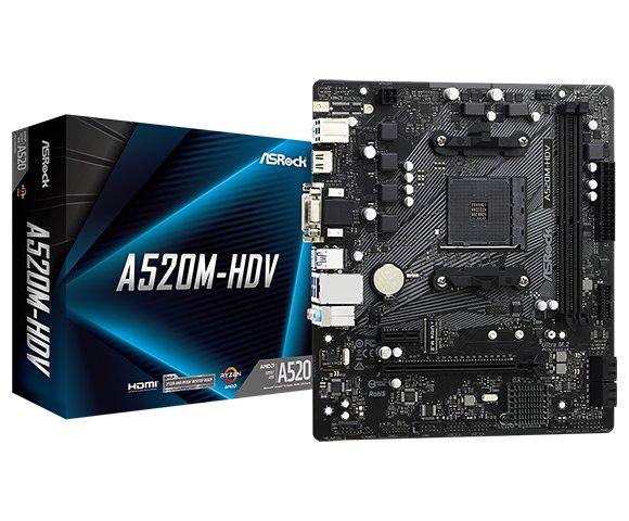 ASRock A520M-HDV matična ploča │ AMD AM4 Ryzen socket, 6-fazni dizajn napajanja, Podrška za DDR4 4733+ (OC), PCIe 3.0 x16 i x1 slotovi, 4 x SATA3 i 1 x Ultra M.2, 6 x USB 3.2 Gen1, 6 x USB 2.0