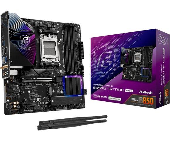 ASRock B850M Riptide WiFi matična ploča, PCIe Gen5 i M.2 podrška, 2.5G LAN i Wi-Fi 7, AMD Socket AM5, 4 x DDR5 DIMM slotovi do 256GB, Micro ATX Form Factor