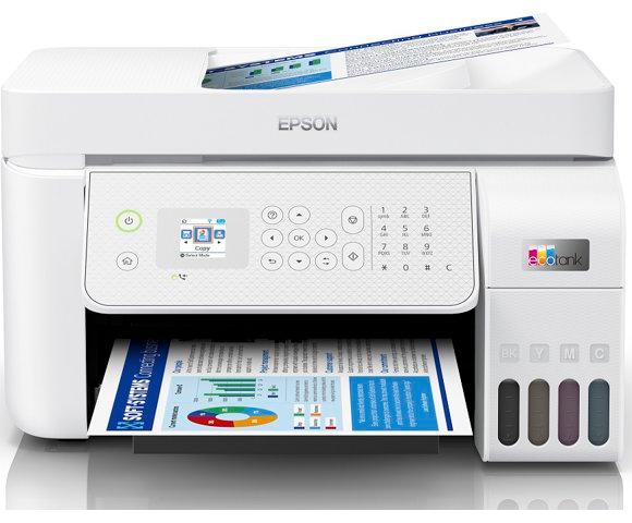 Epson EcoTank L5316 MFP inkjet štampač │ Tehnologija štampe: Inkjet, Štampa: U boji, Rezolucija: 5760 x 1440 DPI, Brzina štampe: 33 ppm (crno), 15 ppm (boja), 10 ipm (ISO mono), 5 ipm (ISO boja), Kopiranje: U boji, 1200 x 2400 DPI, Skeniranje: CIS, ravni + ADF, 1200 x 2400 DPI, Faks: U boji, 33.6 Kbit/s, memorija 100 str., Kapacitet: Ulaz 100 str., Izlaz 30 str., Wi-Fi i LAN, Ekran: LCD, Mobilna štampa: AirPrint, Epson iPrint itd.