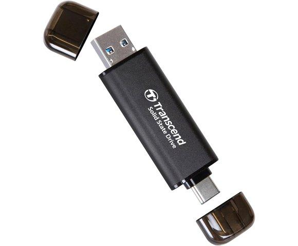 Kućni ljubimciTrascend ESD310 512GB Black prenosivi SSD disk, Brzina prenosa do 10 Gbps, Dva konektora: USB Type-A i Type-C, Kompatibilnost sa Windows, macOS i Android, Brzine čitanja/pisanja do 1050/900 MB/s, 256-bitno AES šifriranje za sigurnost