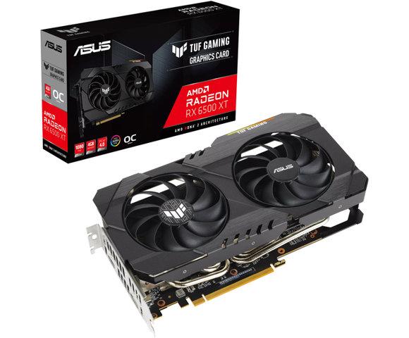 ASUS TUF-RX6500XT-O4G-GAMING Game Clock: 2685 MHz Boost Clock: 2825 MHz Memory: 4096MB GDDR6 Stream Processors: 1024 Max Resolution 7680 x 4320 , 1x HDMI , 1x DisplayPort , PCI Express 4.0 - 90YV0HA0-M0NA00