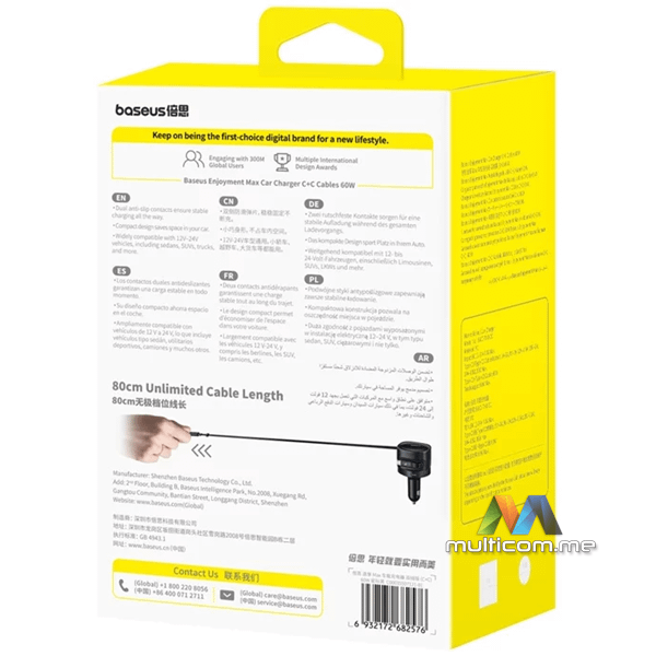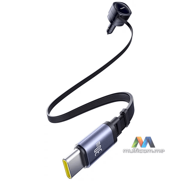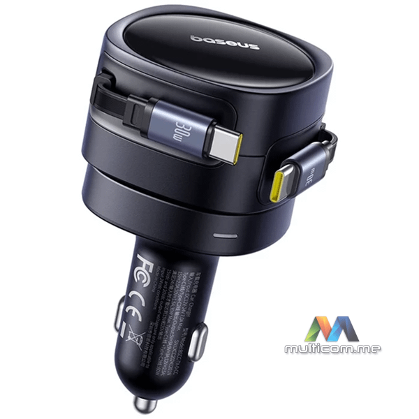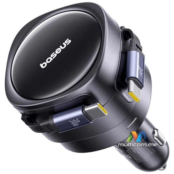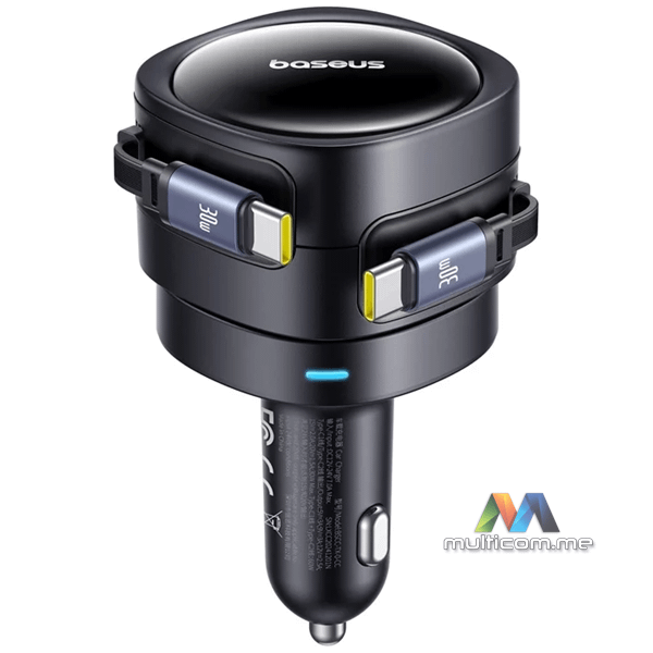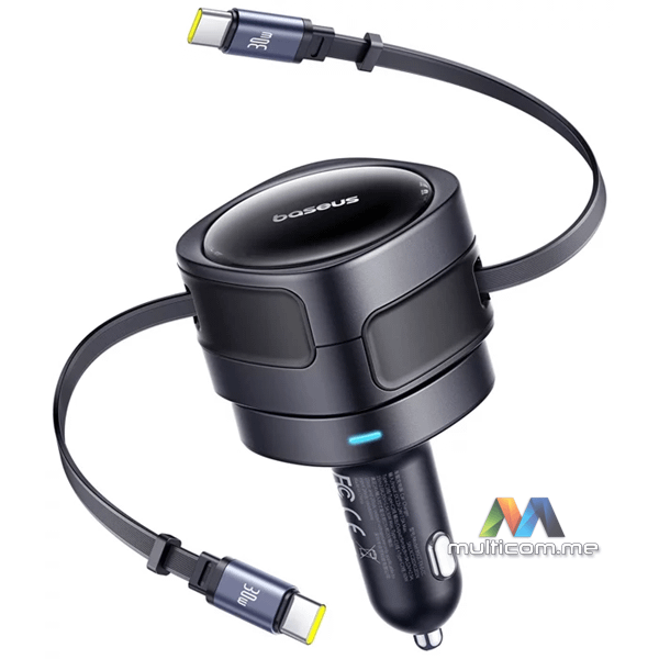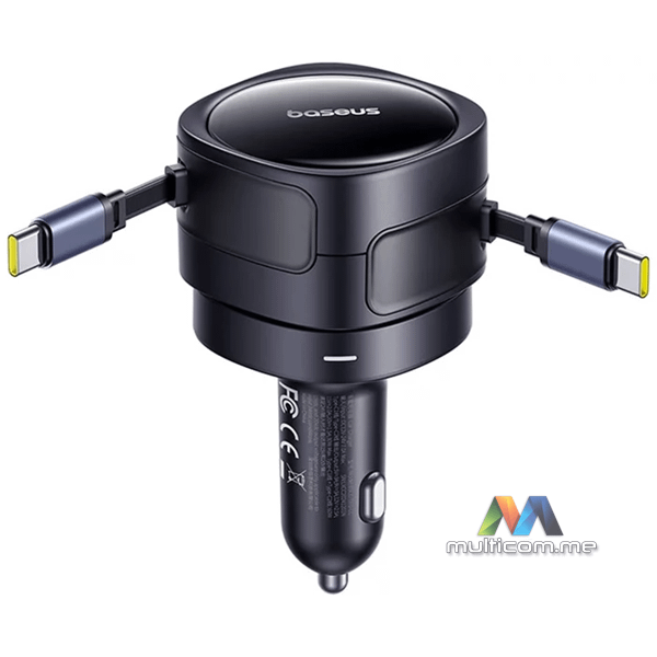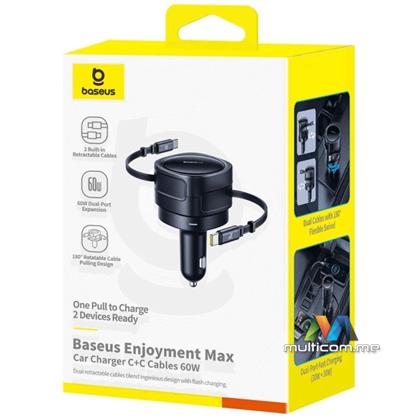 Baseus Enjoyment Max USB-C 60W auto punjač │ Brzo punjenje do 30 W │ Dva USB-C kabla │ Kompatibilnost 12-24 V │ Rotirajući dizajn 180° │ LED osvjetljenje za noćnu upotrebu