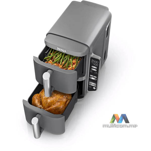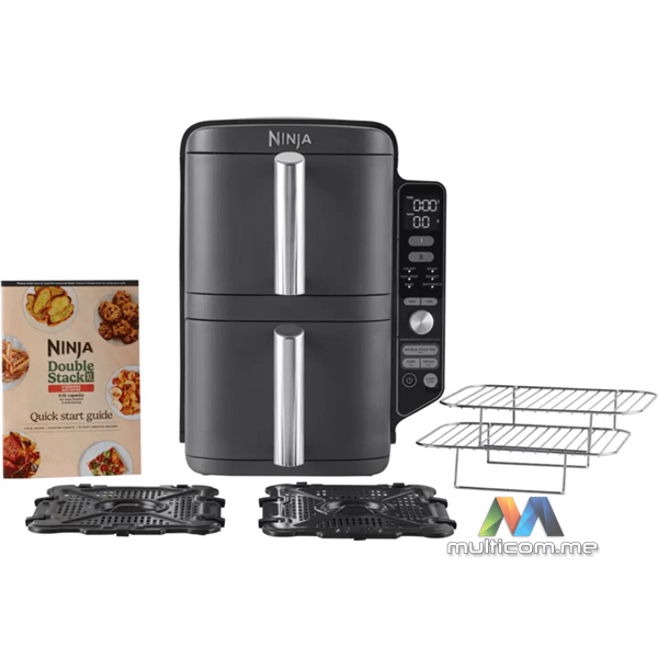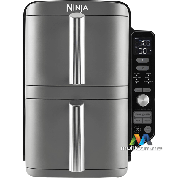 Ninja SL400EU Double Stack XL Air Fryer │ Kapacitet: 9.5 L (2 x 4.75 L) │ Funkcije: Max Crisp, Air Fry, Pečenje, Prženje, Podgrijavanje, Dehidratacija │ Načini rada: SYNC, MATCH │ Nivoi kuvanja: 4 │ Dodaci: 2 crisper ploče, 2 rešetke │ Perivo u mašini za suđe