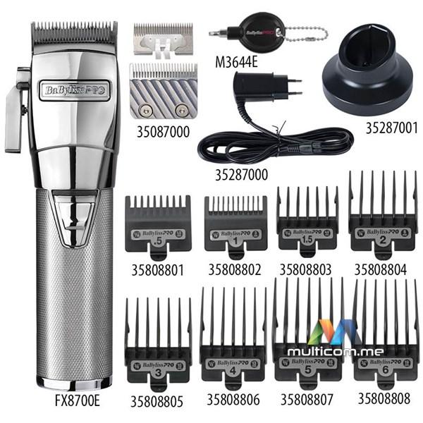 Babyliss CHROMFX CORDLESS CLIPPER aparat za šišanje (FX8700E) - Stalak za punjenje - 45 mm oštrica od japanskog čelika - Brzina sečenja: 6300 pokreta oštrice u minuti - 5 pozicija (0.8 – 1.4 – 2 – 2.8 – 3.5 mm) - 8 nastavaka (1.5 – 3 – 4.8 – 6 – 10 – 13 – 16 – 19 mm) - Četkica za čišćenje i ulje za podmazivanje - 3030050146622