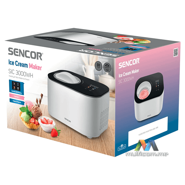 SENCOR SIC 3000WH aparat za sladoled │ Potpuno automatska mašina sa kompresorom │ Kapacitet 1l│ Funkcija održavanja hladnoće 60 minuta │ 4 automatska programa │ Funkcija pravljenja jogurta │ Izmjenjiva posuda