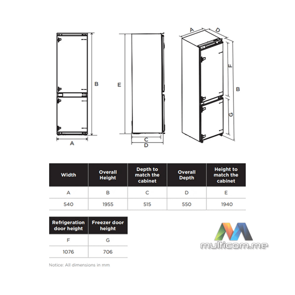 Midea MDRE411FGE01 ugradni kombinovani frižider │ No Frost tehnologija │ Energetska klasa E │ Zapremina frižidera 213 L │ Zapremina zamrzivača 87 L │ Automatsko odmrzavanje │ Elektronske komande │ LED osvjetljenje │ Reverzibilna vrata │ Nivo buke 35 dB │ Visina ugradnje 198 cm