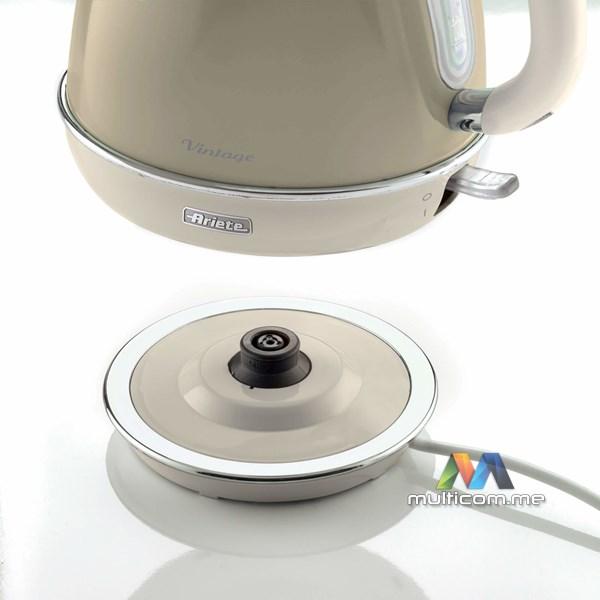 Ariete 2869 Vintage električno kuvalo je dizajnersko kuvalo koje oplemenjuje vašu kuhinju svojim prepoznatljivim oblicima i pastelnim bojama. Zahvaljujući 360° rotirajućem postolju, kuvalo se lako postavlja na svaku kuhinjsku površinu. Vintage električno kuvalo ima kapacitet od 1,7 litara i snagu od 2000 W, što omogućava da voda proključa za svega nekoliko trenutaka, pa možete brzo pripremiti infuzije, čajeve i biljne napitke. Hladna drška i zidovi od nerđajućeg čelika štite vas od slučajnih opekotina. Kuvalo se uključuje jednostavnim pritiskom na dugme, a automatski se isključuje kada voda dostigne tačku ključanja (radi bezbjednosti, isključuje se i kada je prazno). Vintage kuvalo je savršeno za brzo prokuvavanje vode – osnovnog elementa italijanske kuhinje – ali i za pripremu mirisnih čajeva i ukusnih infuzija poput biljnih čajeva, kamilice ili napitaka od ječma.