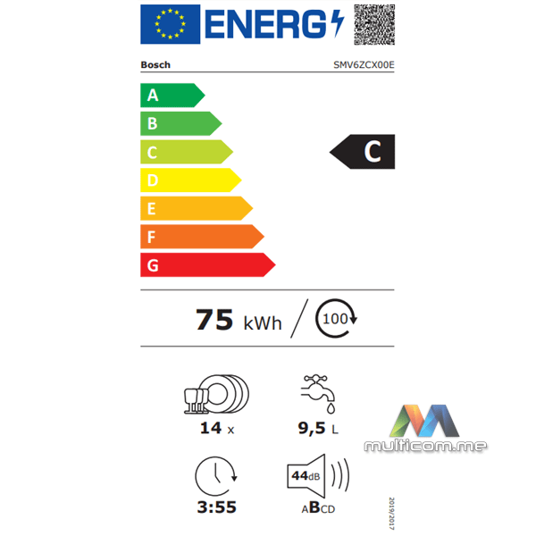 Bosch SMV6ZCX00E Serie | 6 Potpuno ugradna mašina za pranje sudova 60 cm sa kapacitetom od 14 kompleta - Ekonomična na energetskom klasom C - Rackmatic sistem korpi sa mogućnošću podešavanja u 3 nivoa - Minimalna temperatura pranja od 45°C