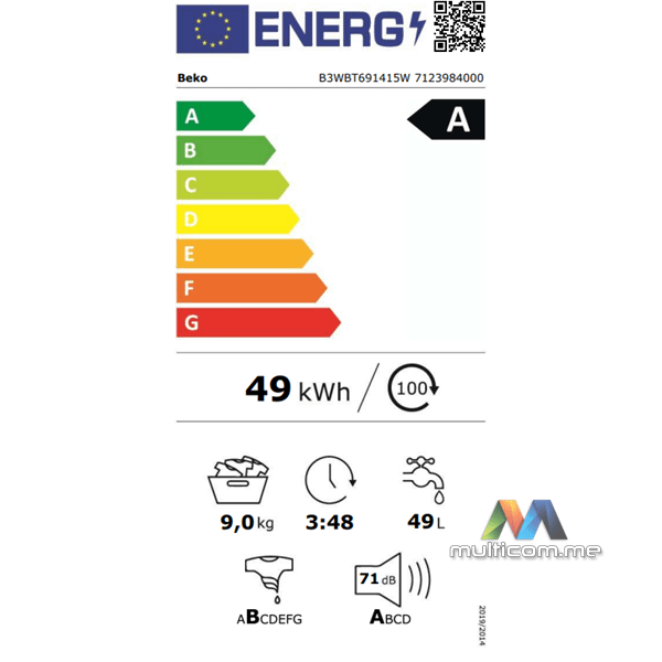 BEKO B3WBT691415W ugradna mašina za pranje veša │ Energetska klasa: A │ Kapacitet: 9 kg │ Obrtaji: 1400 rpm │ Nivo buke: 71 dB │ Potrošnja: 49 kWh/100 ciklusa, 49 l/ciklus │ Programi: 15 │ Dimenzije: 82 x 60 x 55 cm │ Težina: 72 kg