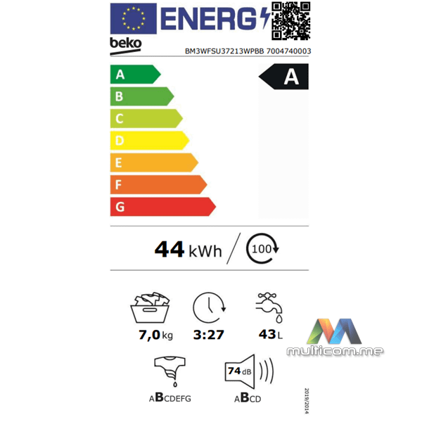Beko b300 BM3WFSU37213WPBB samostojeća veš mašina │ Kapacitet bubnja: 7 kg │ Maksimalna brzina obrtaja: 1200 RPM │ Energetska klasa: A │ Potrošnja energije: 44 kWh na 100 ciklusa │ Potrošnja vode: 43 L po ciklusu │ Nivo buke: 74 dB │ Programi: 15, uključujući Eco, Brzo pranje, Para, Higijena │ Specijalne tehnologije: OptiSense, ProSmart™ inverter motor, SteamCure │ Dimenzije: 600 x 496 x 845 mm │ Težina: 62 kg │ EAN: 8690842655883
