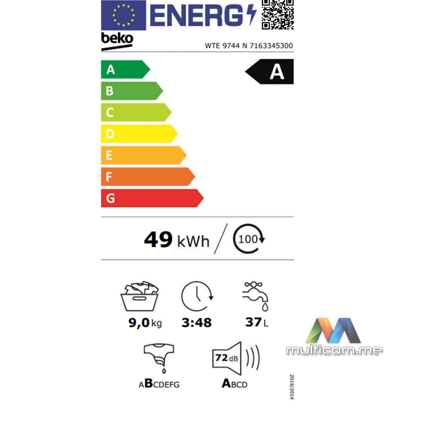 Beko WTE 9744 N mašina za pranje veša - Kapacitet 9kg, Broj obrtaja 1400 rpm, Tehnologije Steam Cure, Stain Expert, Auto program, Hygiene+, ProSmart inverter motor, Anti Creasing