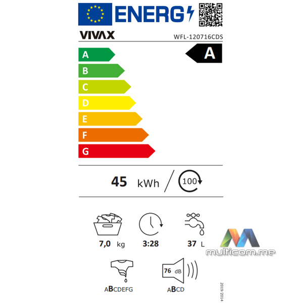 Vivax WFL-120716CDS inverterska mašina za pranje veša │ Kapacitet: 7 kg │ Brzina centrifuge: 1200 o/min │ Slim model │ Punjenje: Prednje │ Broj programa: 16 │ Odgoda starta │ Pretpranje │ Podešavanje centrifuge i temperature │ Energetska klasa: A │ Nivo buke: 76 dB │ Dimenzije: 59,5 x 85 x 42 cm │ Napajanje: 220-240 V │ Težina: 53 kg