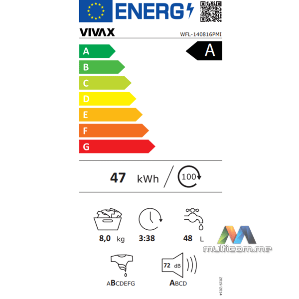 Vivax WFL-140816PMI inverterska veš mašina │ Kapacitet: 8 kg │ Brzina centrifuge: 1400 o/min │ Slim model │ Punjenje: Prednje │ Broj programa: 16 │ Odgoda starta │ Podešavanje temperature i centrifuge │ Dodatno ispiranje │ Energetska klasa: A │ Nivo buke: 72 dB │ Dimenzije: 59,5 x 85 x 56,5 cm │ Napajanje: 220-240 V │ Težina: 68 kg