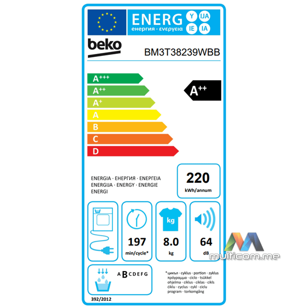 BEKO BM3T38239WBB mašina za sušenje veša │ Kapacitet: 8kg │ Energetska klasa: A++ │ Kapacitet: Toplotna pumpa │ Nivo buke: 64 dBA │ Broj programa: 15 │ Dimenzije: 84.6 x 59.8 x 54.5 cm │ Tehnologije: IonGuard®, Steam Cure │ Bezbjednost: Dečija zaštita, indikatori čišćenja filtera i kondenzatora