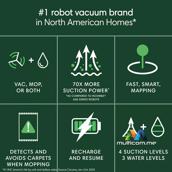 Četvorostepeno čišćenje uključuje 70 puta snažnije usisavanje, četku za više površina i četku za čišćenje ivica koja uklanja prljavštinu i prašinu, plus mikrofiber mop za sjajne i čiste podove.