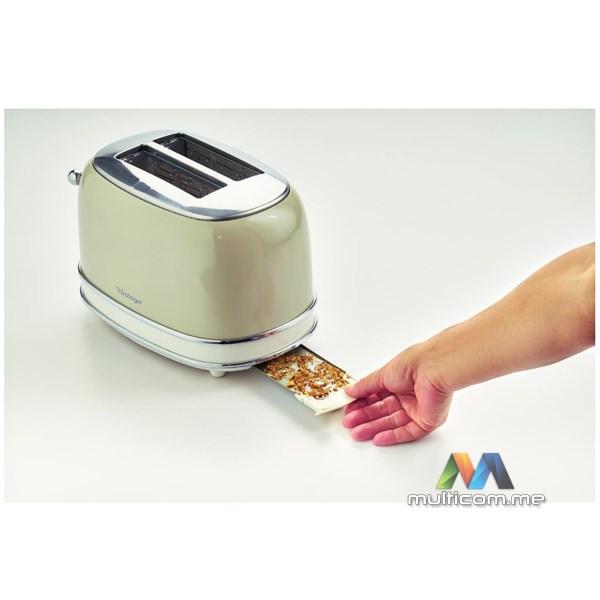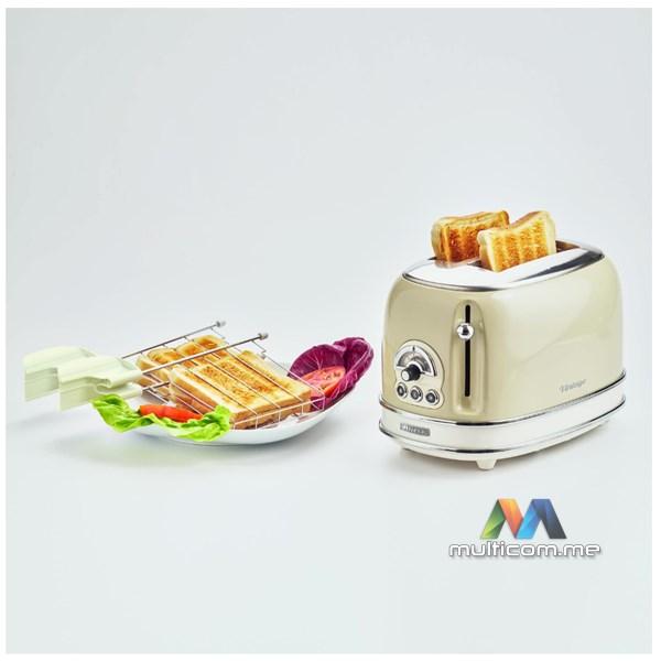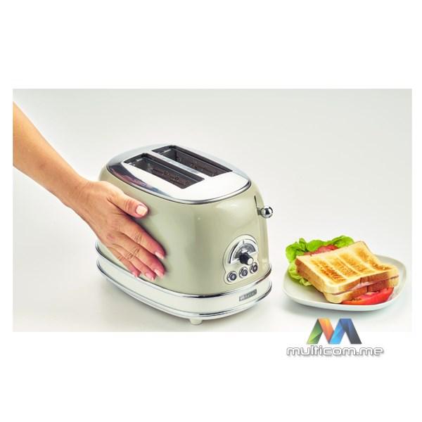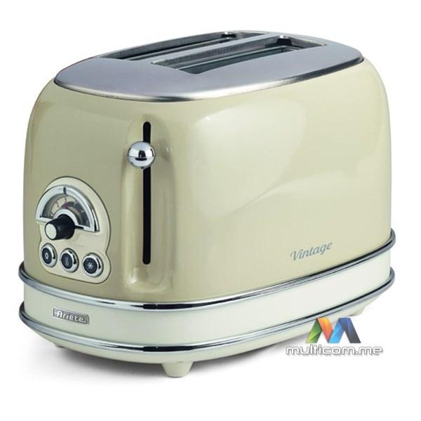 Ariete 155 Vintage električni toster je dizajnerski toster koji, zahvaljujući svojim jedinstvenim oblicima i pastelnim bojama, ukrašava tvoju kuhinju. Kompaktne dimenzije tostera (30 cm dužine x 19 cm širine x 20 cm visine) čine ga savršenim dekorativnim elementom za svaku kuhinju. Vintage električni toster ima 2 otvora za tostiranje kriški hljeba na 6 različitih nivoa pečenja. Kada je tost gotov, automatska funkcija izbacivanja omogućava ti da bezbjedno uzmeš krišku hljeba. Uklonjiva posuda za mrvice olakšava čišćenje, dok donji prostor za kabl omogućava uštedu prostora. Vintage toster odlikuje se čvrstim dizajnom: spoljašnji zidovi od nerđajućeg čelika u pastelnim bojama čine ga jedinstvenim i prepoznatljivim u svijetu malih kućnih aparata.