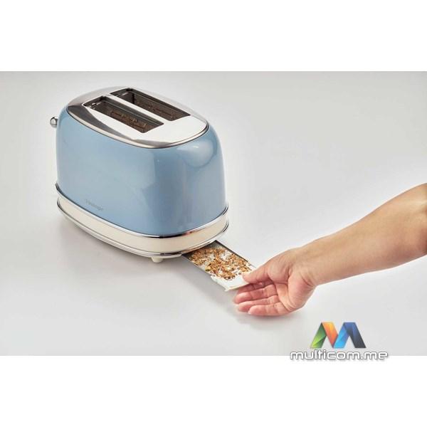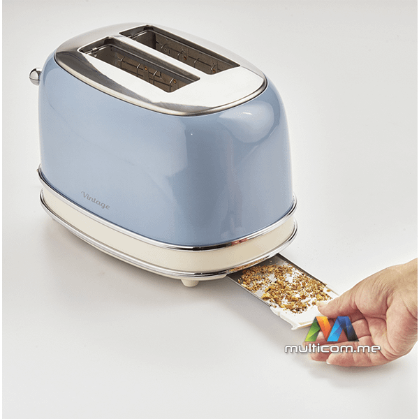 Ariete 155 Vintage električni toster je dizajnerski toster koji, zahvaljujući svojim jedinstvenim oblicima i pastelnim bojama, ukrašava tvoju kuhinju. Kompaktne dimenzije tostera (30 cm dužine x 19 cm širine x 20 cm visine) čine ga savršenim dekorativnim elementom za svaku kuhinju. Vintage električni toster ima 2 otvora za tostiranje kriški hljeba na 6 različitih nivoa pečenja. Kada je tost gotov, automatska funkcija izbacivanja omogućava ti da bezbjedno uzmeš krišku hljeba. Uklonjiva posuda za mrvice olakšava čišćenje, dok donji prostor za kabl omogućava uštedu prostora. Vintage toster odlikuje se čvrstim dizajnom: spoljašnji zidovi od nerđajućeg čelika u pastelnim bojama čine ga jedinstvenim i prepoznatljivim u svijetu malih kućnih aparata.