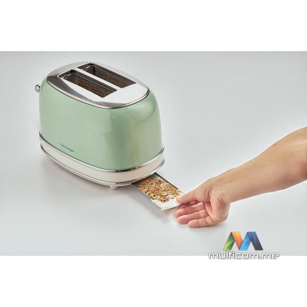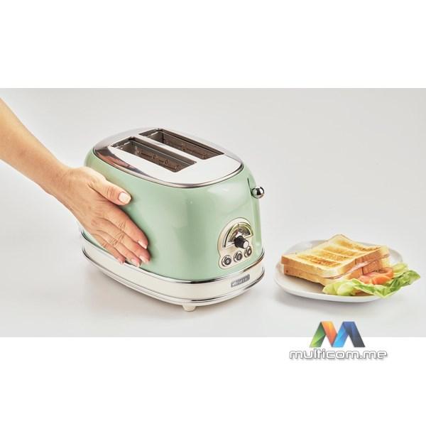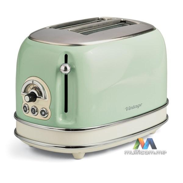 Ariete 155 Vintage električni toster je dizajnerski toster koji, zahvaljujući svojim jedinstvenim oblicima i pastelnim bojama, ukrašava tvoju kuhinju. Kompaktne dimenzije tostera (30 cm dužine x 19 cm širine x 20 cm visine) čine ga savršenim dekorativnim elementom za svaku kuhinju. Vintage električni toster ima 2 otvora za tostiranje kriški hljeba na 6 različitih nivoa pečenja. Kada je tost gotov, automatska funkcija izbacivanja omogućava ti da bezbjedno uzmeš krišku hljeba. Uklonjiva posuda za mrvice olakšava čišćenje, dok donji prostor za kabl omogućava uštedu prostora. Vintage toster odlikuje se čvrstim dizajnom: spoljašnji zidovi od nerđajućeg čelika u pastelnim bojama čine ga jedinstvenim i prepoznatljivim u svijetu malih kućnih aparata.